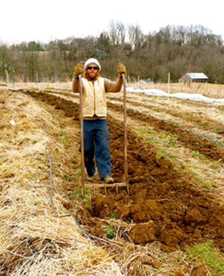 Photo: Broadforking a raised bed in the spring. Photo courtesy of Susquehanna Farm School.