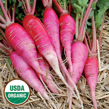 Seed Savers Exchange Packet (Organic) Introduced in the US circa 1850. Dark pink 5" roots fade to pale pink at the tips. Very hardy fall/winter rad...
