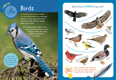 Jump-start curiosity with this take-along field guide for children ages 4 to 8. From worms, birds, and spiders to trees, flowers, and clouds, young explorers learn what to look and listen for wherever they are — whether in a nature preserve, an urban park, or a suburban backyard. Seek-and-find lists, on-the-trail art projects, and discovery games get kids engaged in hands-on learning about nature, and a real pull-out magnifying glass helps them get a close-up glimpse of leaf veins, seed pods, and tiny insects. Filled with activities, checklists, and stickers, this interactive nature guide belongs in every kid’s backpack.