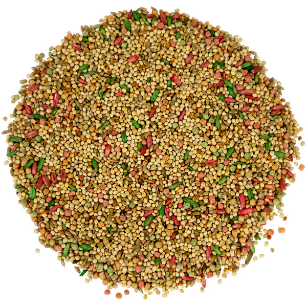 INGREDIENTS: White Millet, Canary Seed, Red Millet, Green Oat Groat, Red Oat Groat, Ground Corn, Soybean Meal, Ground Wheat, Soy Oil, Corn Gluten Meal, Monocalcium Phospate, Dicalcium Phosphate, Calcium Carbonate, L-Lysine, Monohydrochloride, Salt, DL-Methionine, Choline Chloride, Zinc Sulfate, DL-Alpha Tocopheryl Acetate (Source Of Vitamin E Activity), Sodium Selenite, Niacin Supplement, Manganese Sulfate, Iron (Ferrous) Sulfate, Copper Sulfate, Manganous Oxide, D-Calcium Pantothenic Acid, Vegetable Fat, Riboflavin, Vitamin A acetate, D-Activated Animal Sterol (Source Of Vitamin D Activity), Mineral Oil, Menadione Nicotinemide Bisulfite (Source Of Vitamin K Activity), D-Biotin, Vitamin B-12 Supplement, Mixed Tocoperols Of Natural Origin, Rosemary Extract, Citric Acid, Lecithins, Ethoxyquin (A Preservative), Calcium Iodate, Pyridoxine Hydrochloride and Folic Acid, Artificial Flavorings