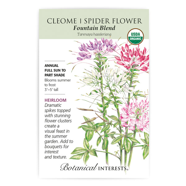 (Organic Heirloom) The large flower clusters, interesting seed pods, and striking palm-like leaves on tall plants add drama to any garden. Great for attracting butterflies and hummingbirds. A wonderful, fragrant, cut flower in shades of white, pink, rose, and violet. Plants require little care and remain attractive even in heat, tolerate some drought, and often reseed to come back year after year.