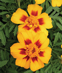 (Single French Marigold) Stunning, bold yellow petals with maroon throats. Very rain resistant. Height: 10-12 inches. (approx. 50 seeds/pkt)