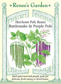 (Heirloom) This mix contains the pretty patterned Rattlesnake beans that are delicious as fresh pods or for dried beans and the Purple Pole which are renowned for tenderness, flavor and reliability. Their contrasting color stands out from vines making them easy to harvest. (approx. 55 seeds/pkt)